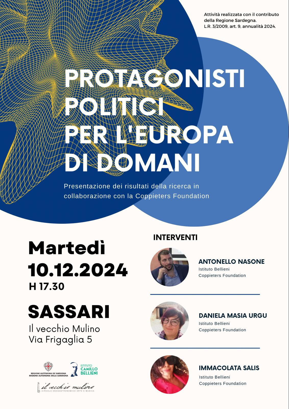 Martedì 10 dicembre, alle 17.30, al Vecchio Mulino di via Frigaglia 5 a Sassari, l’Istituto Camillo Bellieni presenterà “Political figures for the Europe of the future”, un progetto di ricerca che ha coinvolto la Coppieters Foundation di Bruxelles nell’analisi di otto personaggi del Novecento che hanno caratterizzato la dimensione del federalismo europeo delle comunità. All’incontro interverranno Antonello Nasone, Daniela Masia Urgu e Immacolata Salis.