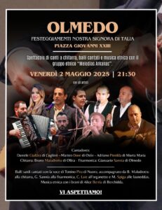 Il 2 maggio si riparte con la Santa Messa e la processione per le vie del paese. Il pomeriggio sarà animato dai vigili del fuoco in pensione con “Pompieropoli”, percorso ludico-educativo per bambini e bambine che otterranno l’attestato di “Piccolo Pompiere”. A seguire, una serata ricca di folklore e con i balli dell’“Associazione Folk Culturale Nostra Signora di Talia”, il canto a chitarra con Daniele Giallara, Matteo Dore, Adriano Piredda, Bruno Maludrottu e Gianuario Sannia. In serata, le note del gruppo Melodias Arkanas e i balli sardi cantati da Tonino Pira e suonati da Costantino Lai e Mauro Spiga.