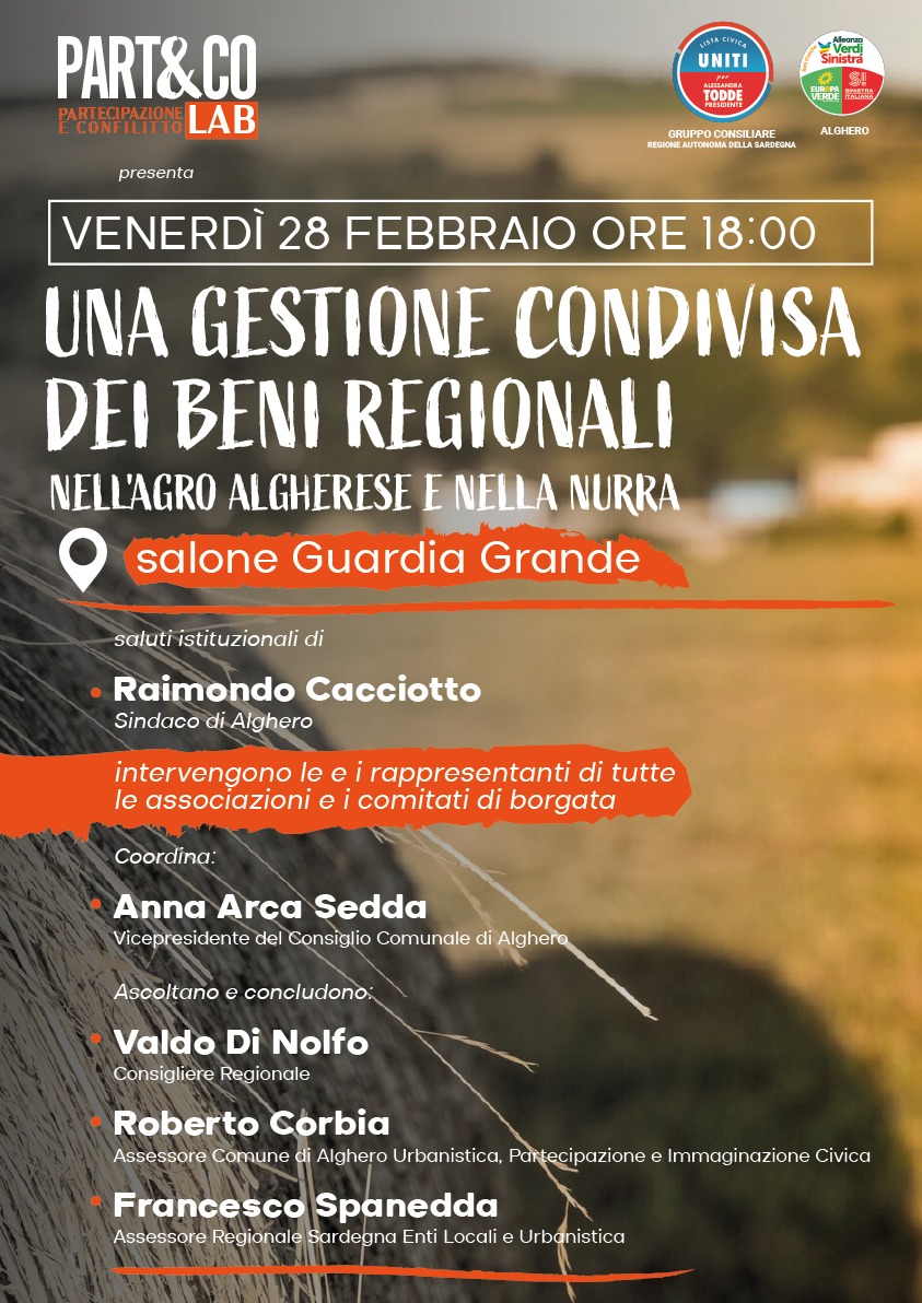 Venerdì 28 febbraio, alle ore 18.00, nel salone di Guardia Grande (borgata del comune di Alghero) si terrà l’iniziativa “Una gestione condivisa dei beni regionali nell’agro algherese e nella Nurra”. L’incontro, organizzato in collaborazione con il gruppo consiliare in Consiglio Regionale Uniti per Todde, sarà un’occasione di confronto sul futuro della gestione dei beni regionali presenti nel territorio.