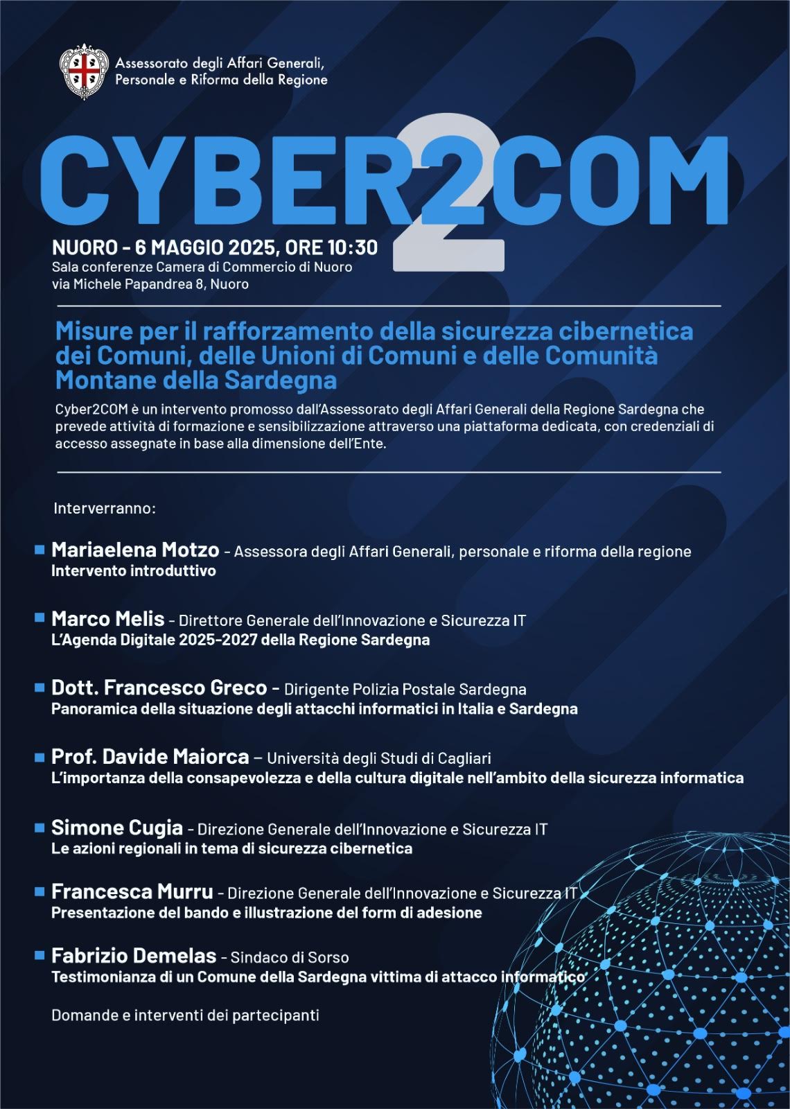 Martedì 6 maggio, alle 10.30, nella sala conferenze della Camera di Commercio di Nuoro in via M. Papandrea 8, si terrà un incontro per illustrare il bando Cyber2COM, intervento che mira al rafforzamento della sicurezza cibernetica degli enti locali, promosso dall’assessorato regionale degli Affari generali. La misura è rivolta a Comuni, Unioni dei Comuni e Comunità montane dell’Isola e prevede attività di formazione e sensibilizzazione attraverso una piattaforma dedicata, con credenziali di accesso assegnate in base alla dimensione dell’Ente.