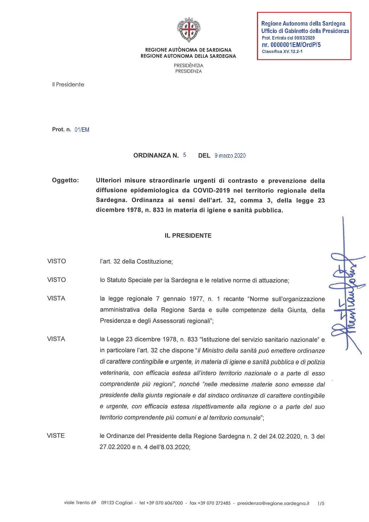 – viene trasmessa secondo le rispettive competenze al Presidente del Consiglio dei Ministri. al Ministro della Salute. ai Prefetti degli Uffici territoriali di governo della Sardegna, agli Assessori regionali.
