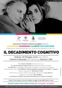 Sabato 28 maggio, dalle 16.00, l’Associazione Malattia Alzheimer Sardegna organizza al Centro Culturale di Sennori (in via Farina) un nuovo appuntamento dedicato al “Decadimento cognitivo”, con l’idea di spingere l’assessorato regionale alla Sanità a promuovere, potenziare e finanziare la diagnosi precoce anche per patologie come l’Alzheimer, con conseguenti benefici per l’intera comunità sia da un punto di vista sanitario che sociale.