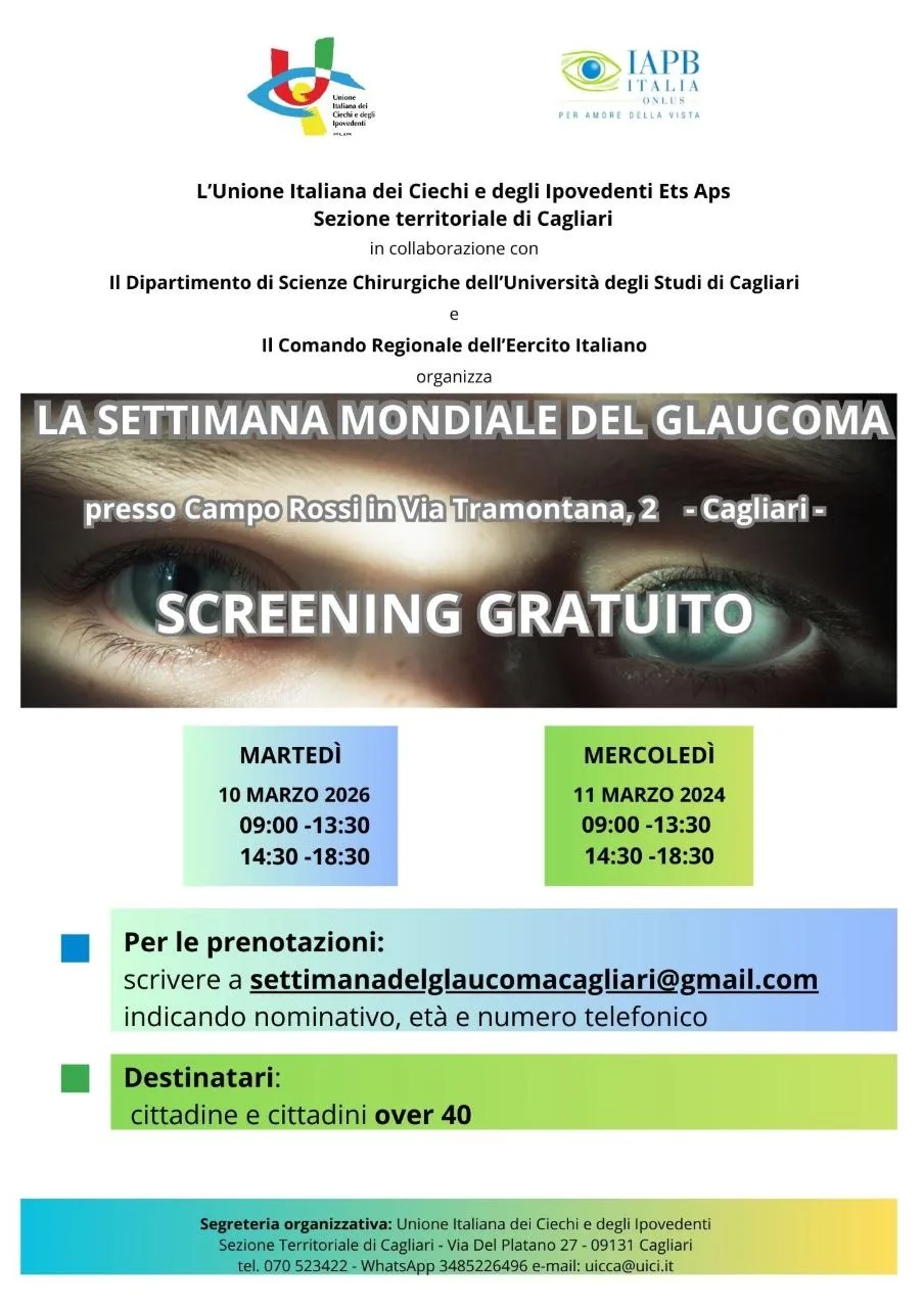 In occasione della ‘Settimana Mondiale del Glaucoma’, in programma dall’8 al 14 marzo, la sezione territoriale di Cagliari dell’Unione Italiana dei Ciechi e degli Ipovedenti Onlus – APS organizza per domani e dopodomani (10 e 11 marzo) visite gratuite alla vista. L’Ambulatorio Mobile Oculistico (AMO) dell’Unione, messo a disposizione dallo IAPB Italia, sarà ospitato al Campo Rossi (in Via Tramontana, a Cagliari), grazie alla collaborazione con il Comando militare Esercito Sardegna.