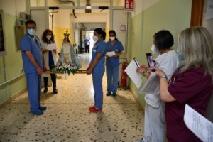 Il simulacro è stato quindi preso in consegna dai cappellani che lo hanno accompagnato per la visita all’interno dell’ospedale. Ad ogni reparto la statua della Vergine è stata presa “in consegna” da due infermieri o da due operatori sociosanitari che l’hanno portata dai pazienti, all’interno delle stanze di degenza.