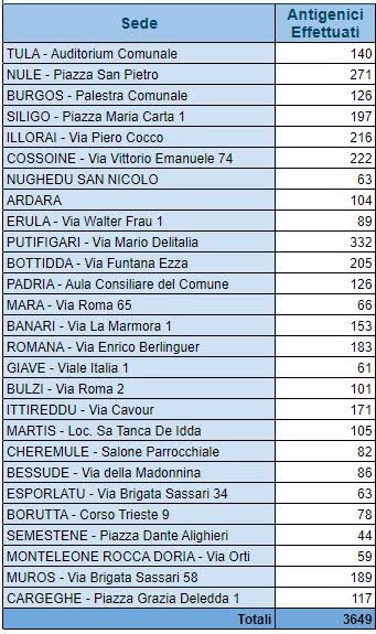 “Sardi e sicuri”, la campagna di screening della Regione per il contrasto alla diffusione del Covid-19 ha chiuso l’ultima tappa nel Sassarese con il coinvolgimento di ventisette piccoli comuni che hanno concentrato l’attività di monitoraggio in un’unica giornata. Nel complesso sono stati 3.649 i test antigenici eseguiti nelle sedi operative di Tula, Nule, Burgos, Siligo, Illorai, Cossoine, Nughedu San Nicolò, Ardara, Erula, Putifigari, Bottida, Padria, Mara, Banari, Romana, Giave, Bulzi, Ittireddu, Martis, Cheremule, Bessude, Esporlatu, Borutta, Semestene, Monteleone Rocca Doria, Muros e Cargeghe.