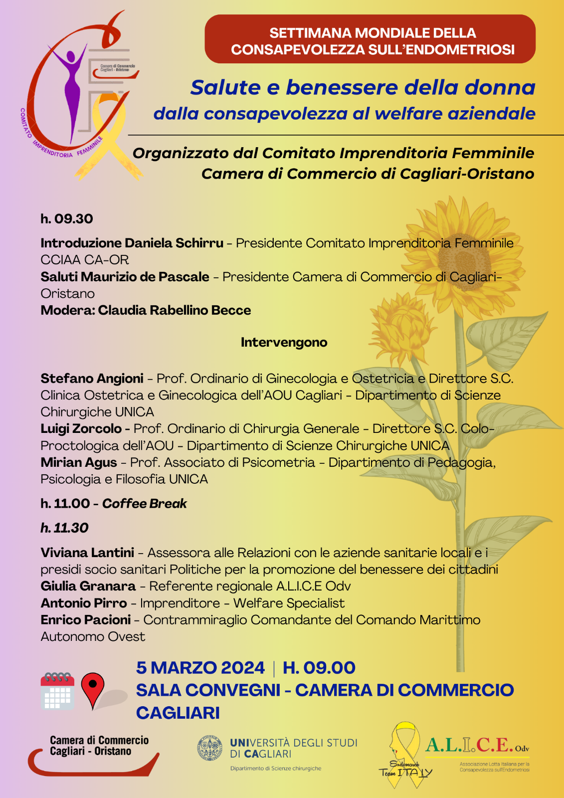 ‘Salute e benessere della donna. Dalla consapevolezza al welfare aziendale’: è il tema del convegno organizzato dal Comitato Imprenditoria Femminile della Camera di Commercio di Cagliari-Oristano, in collaborazione con il Dipartimento di Scienze Chirurgiche dell’Università di Cagliari, in occasione della settimana mondiale della consapevolezza sull’endometriosi.