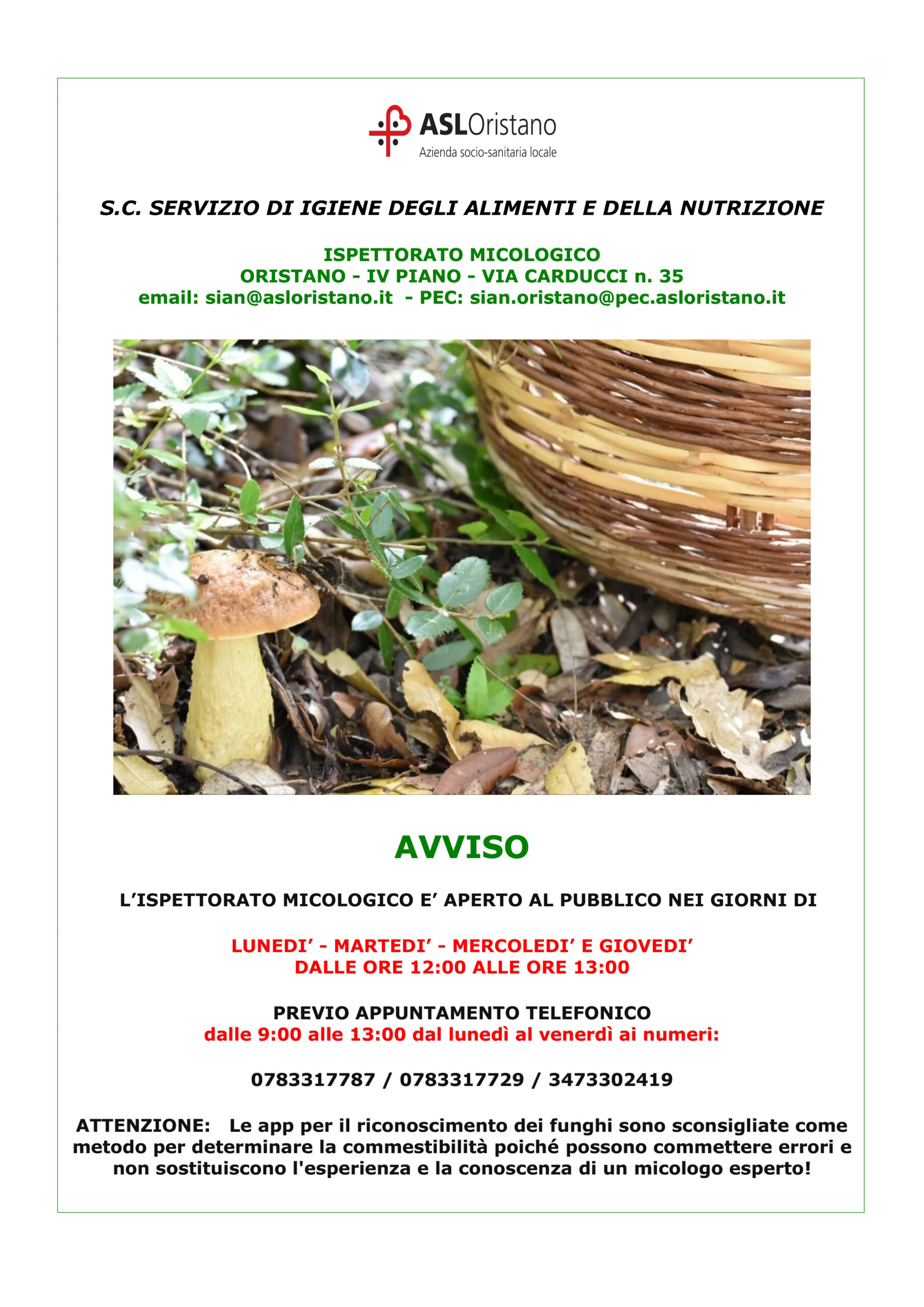 Con l’approssimarsi della stagione autunnale e la ripresa della raccolta di funghi spontanei, l’Azienda sanitaria locale n. 5 di Oristano ricorda che è a disposizione dei cittadini l’Ispettorato micologico, un servizio gratuito che assicura la consulenza sulla commestibilità delle specie raccolte garantendone il consumo sicuro. Istituito presso il Servizio Igiene degli alimenti e della nutrizione (Sian), con sede in via Carducci, 35 a Oristano, l’Ispettorato micologico, composto da personale qualificato e abilitato, non solo svolge attività di prevenzione e controllo gratuito sulle qualità di funghi spontanei destinati al consumo diretto, ma promuove anche corsi di formazione e di educazione sanitaria e fornisce le certificazioni di commestibilità per la vendita al dettaglio e per la ristorazione.