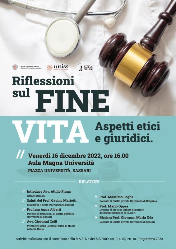 Si terrà venerdì 16 dicembre, alle 16.00, nell’Aula Magna dell’Università di Sassari, un convegno dal titolo “Riflessioni sul fine vita, aspetti etici e giuridici”, organizzato dall’Istituto Camillo Bellieni in collaborazione con l’Università di Sassari e con il contributo della Regione Autonoma della Sardegna.