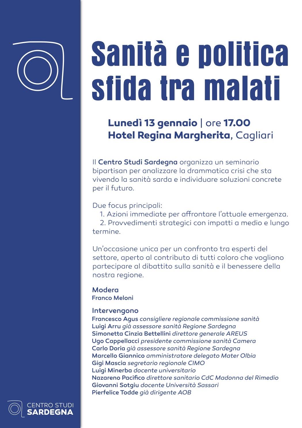 Si intitola “Sanità e politica: sfida tra malati” il seminario organizzato dal Centro Studi Sardegna, CSS, che si terrà lunedì 13 a partire dalle ore 17.00 all’hotel Regina Margherita di Cagliari. L’evento vedrà la partecipazione di un pool di esperti che analizzerà lo stato di salute della sanità sarda individuando azioni, strategie e strumenti da utilizzare nel breve e poi nel lungo termine. Diviso, infatti, in due focus – azioni immediate per affrontare l’attuale emergenza sanitaria e strategie di lungo periodo per una sanità più efficiente e sostenibile – l’evento rappresenta un’occasione unica per affrontare in modo bipartisan i principali problemi della sanità regionale.