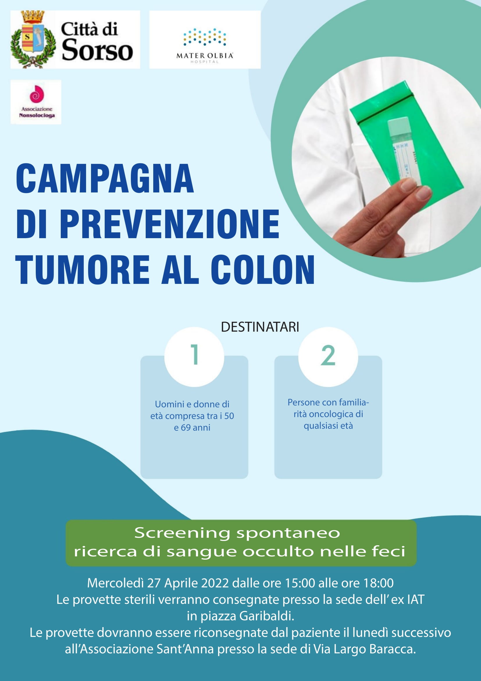 L’Amministrazione comunale di Sorso in collaborazione con l’Associazione “Non solo Cioga”, con il laboratorio analisi del Mater Olbia Hospital e con il supporto dell’Associazione di volontariato Sant’Anna di Sorso, hanno promosso una campagna di screening spontaneo per la prevenzione del tumore al colon rivolta a uomini e donne di età compresa tra i 50 ed i 69 anni e a persone di qualsiasi età con familiarità oncologica.