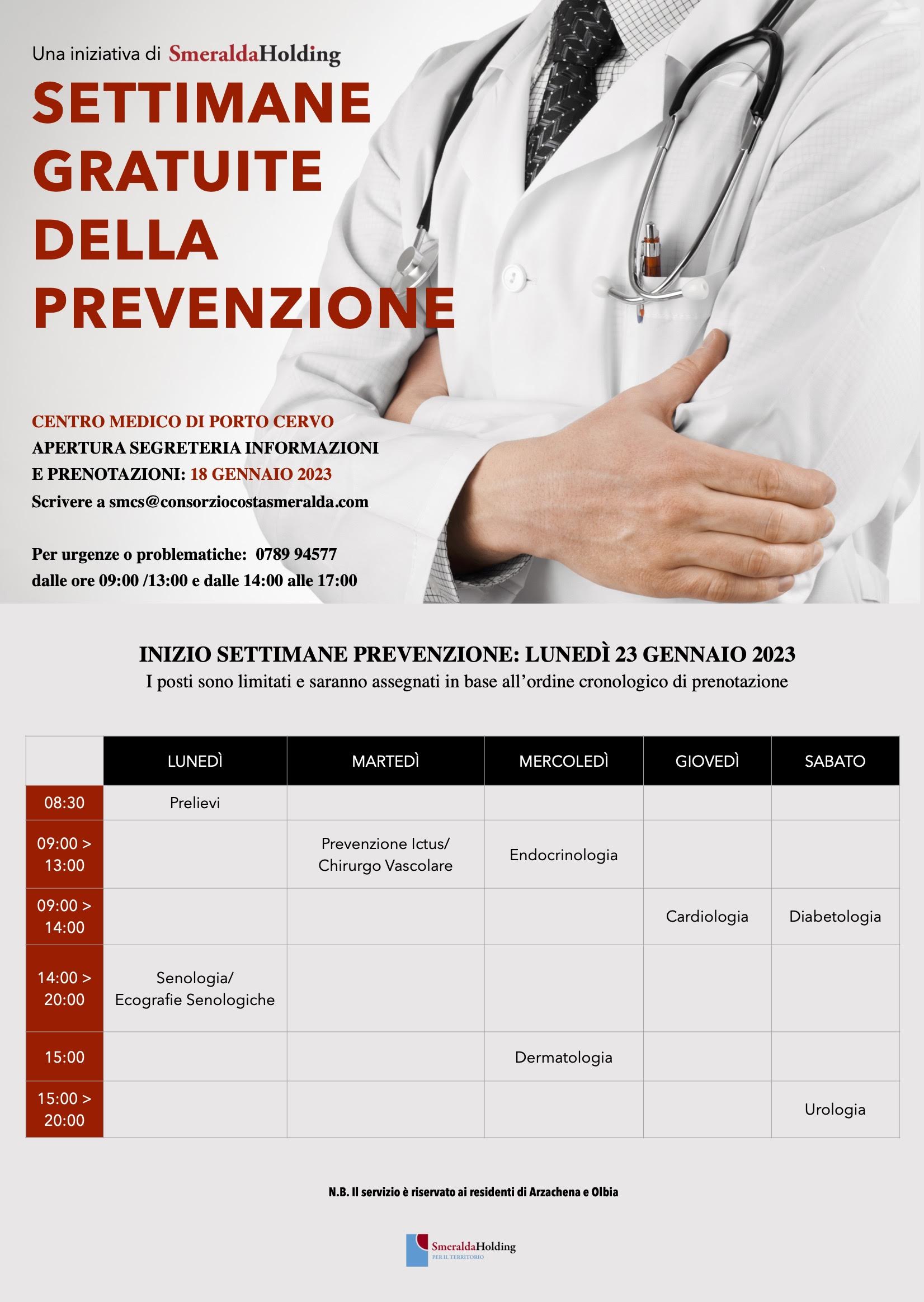 Dal 23 gennaio 2023 fino al 28 febbraio 2023, per 5 settimane, è in programma un calendario di visite di controllo gratuite totalmente offerte dal Gruppo Smeralda Holding e riservate ai cittadini residenti ad Arzachena e Olbia presso l’ambulatorio del Centro Medico a Porto Cervo in via Aga Khan.