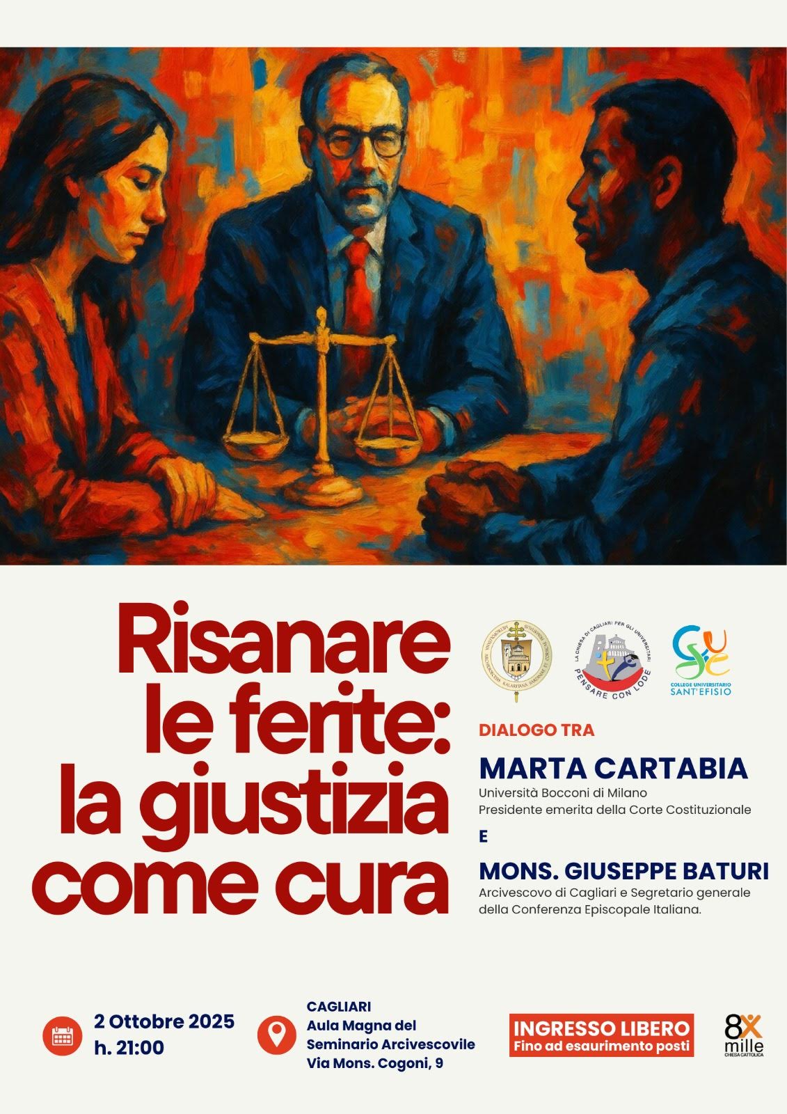 Giovedì 2 ottobre 2025, alle 21.00, nell’Aula Magna del Seminario Arcivescovile di Cagliari (via Mons. Cogoni 9), si terrà un incontro dedicato al tema “Risanare le ferite: la giustizia come cura”, promosso dall’Ufficio diocesano di Pastorale universitaria in collaborazione con il College Sant’Efisio.