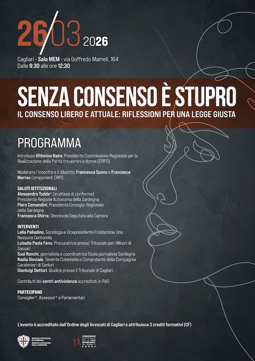 La Commissione regionale per la realizzazione della parità tra uomini e donne della Regione Sardegna organizza l’incontro pubblico dal titolo “SENZA CONSENSO È STUPRO. Il consenso libero e attuale: riflessioni per una legge giusta”, in programma giovedì 26 marzo, dalle 9.30 alle 12.30, a Cagliari, nella Sala MEM, in via Goffredo Mameli, 164. L’iniziativa nasce con l’obiettivo di promuovere un momento di approfondimento e confronto sul disegno di legge di riforma dell’articolo 609-bis del Codice penale in materia di violenza sessuale, approvato il 27 gennaio 2026, che introduce un impianto normativo fondato sul modello del “dissenso”.