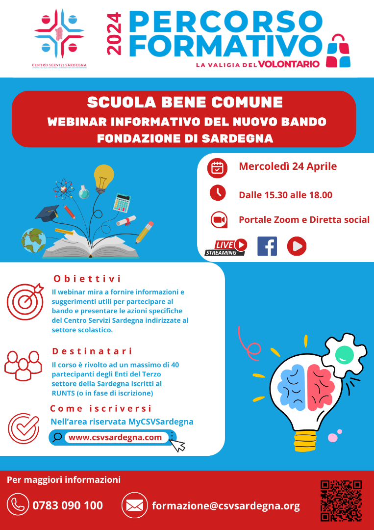 Il bando “Scuola bene comune”, pubblicato nei giorni scorsi dalla Fondazione di Sardegna, sarà al centro del webinar informativo organizzato dal Centro servizi per il volontariato – Csv Sardegna, in programma mercoledì 24 aprile dalle 15.30 alle 18.00 sulla piattaforma Zoom. Il webinar, tenuto dal docente Davide Vitiello, offrirà ai partecipanti le informazioni e i suggerimenti necessari per partecipare al bando, che ha l’obiettivo di contrastare la dispersione scolastica ampliando l’apertura delle scuole oltre i consueti orari e il calendario scolastico, coinvolgendo gli istituti scolastici, gli enti locali e il Terzo settore per valorizzare la scuola come centro della vita sociale delle comunità. La videoconferenza è anche un’opportunità per illustrare le azioni specifiche del Csv Sardegna indirizzate agli Ets che operano o hanno interesse ad operare nel mondo della scuola. I lavori di mercoledì si concluderanno con l’intervento di Filippo Spanu, consulente del Csv Sardegna.