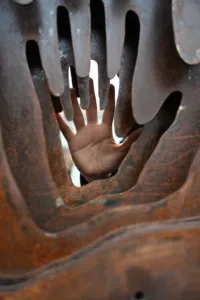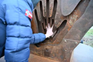 L’opera rappresenta una mano monumentale composta da sette lastre di acciaio, simbolo della forza collettiva necessaria per contrastare la violenza e spezzare il muro del