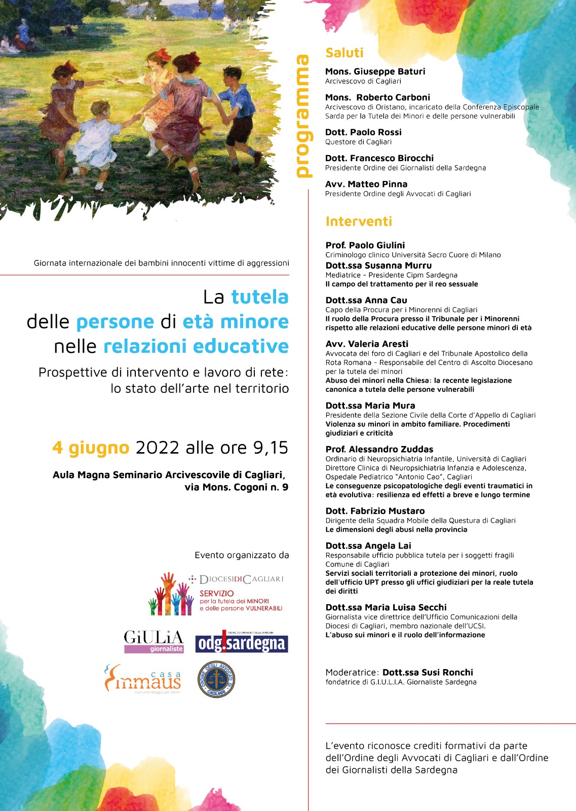 Ai saluti iniziali dell’arcivescovo di Cagliari e vicepresidente della Cei monsignor Giuseppe Baturi, dell’arcivescovo di Oristano e delegato della Conferenza episcopale sarda per la tutela dei minori e delle persone vulnerabili monsignor Roberto Carboni, del questore di Cagliari Paolo Rossi e dei presidenti degli ordini regionali dei giornalisti e degli avvocati, rispettivamente Francesco Birocchi e Matteo Pinna, seguiranno le relazioni.