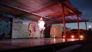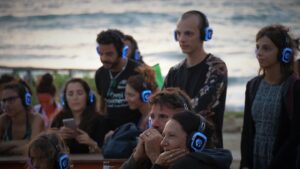 Silvia Pinna, che è diplomata con lode all’Accademia nazionale di danza ed è laureata alla Sapienza in Forme e tecniche dello spettacolo, con le sue movenze agili e delicate ha simulato un viaggio fantastico in luoghi sconosciuti e particolari, dal grattacielo più alto agli abissi del mare, immersi nelle musiche ideate appositamente per l’ascolto in cuffia da Michele Moi.