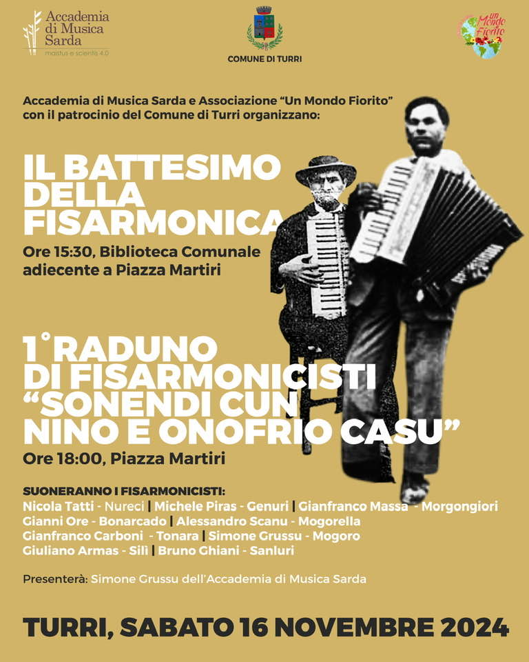 L’Accademia di musica sarda e l’associazione “Un mondo fiorito”, con il patrocinio del comune di Turri, hanno organizzato, per sabato 16 novembre dalle 15.30, il battesimo della fisarmonica che si terrà nella biblioteca comunale, adiacente a Piazza Martiri.