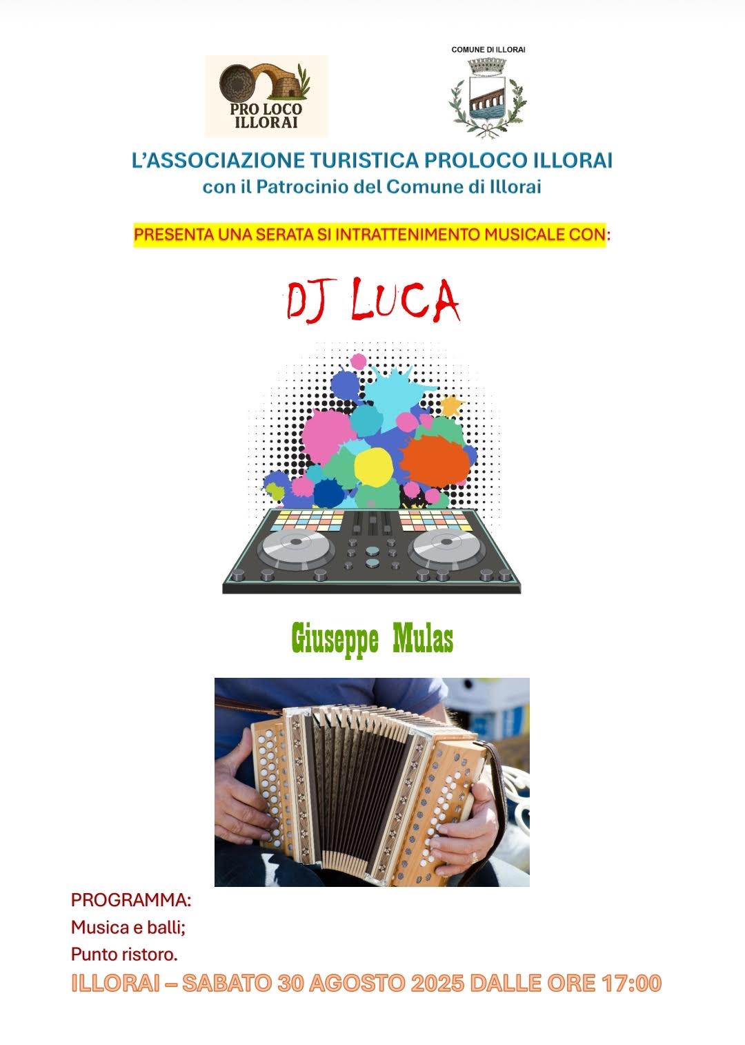Sabato 30 agosto nella Piazza IV Novembre, location accogliente e di atmosfera, si terrà una serata di intrattenimento musicale con il DJ Luca e il fisarmonicista Giuseppe Mulas; entrambi virtuosi artisti locali di grandi potenzialità.