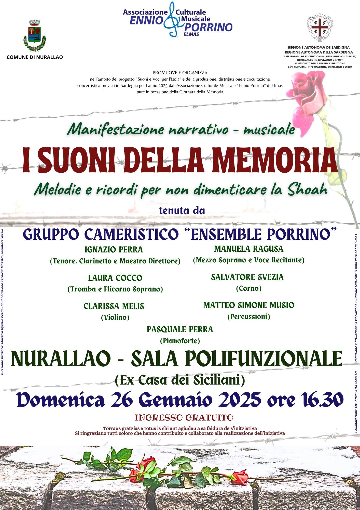 L’appuntamento musicale, promosso in occasione della Giornata della Memoria, avrà inizio alle 16.30 e sarà caratterizzato dall’esecuzione di un repertorio di celebri melodie classiche, popolari, tradizionali e contemporanee (anche sarde) alternata alla lettura in forma narrata di brani e testi letterari (di autori vari) attinenti alla tematica della Shoa.