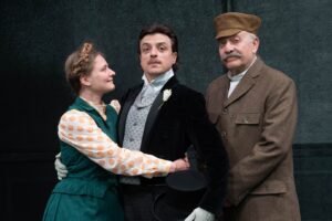 Sotto i riflettori Maddalena Crippa, una della regine del teatro italiano, insieme con un affiatato cast, formato da (in ordine alfabetico) Alessandro Averone, Sergio Basile, Gianluigi Fogacci, Alessandro Sampaoli e Emilia Scatigno, per un avvincente e divertente trittico che comprende “L’Orso”, “I Danni del Tabacco” e “La Domanda di Matrimonio”, tre pièces in bilico tra farsa e tragedia, nello stile del vaudeville e del monologo satirico, con scenografie di Ferdinand Woegerbauer, costumi di Anna Maria Heinreich e disegno luci di Andrea Violato (assistente alla regia Carlo Bellamio), produzione Tieffe Teatro – Milano e Teatro Quirino Srl.