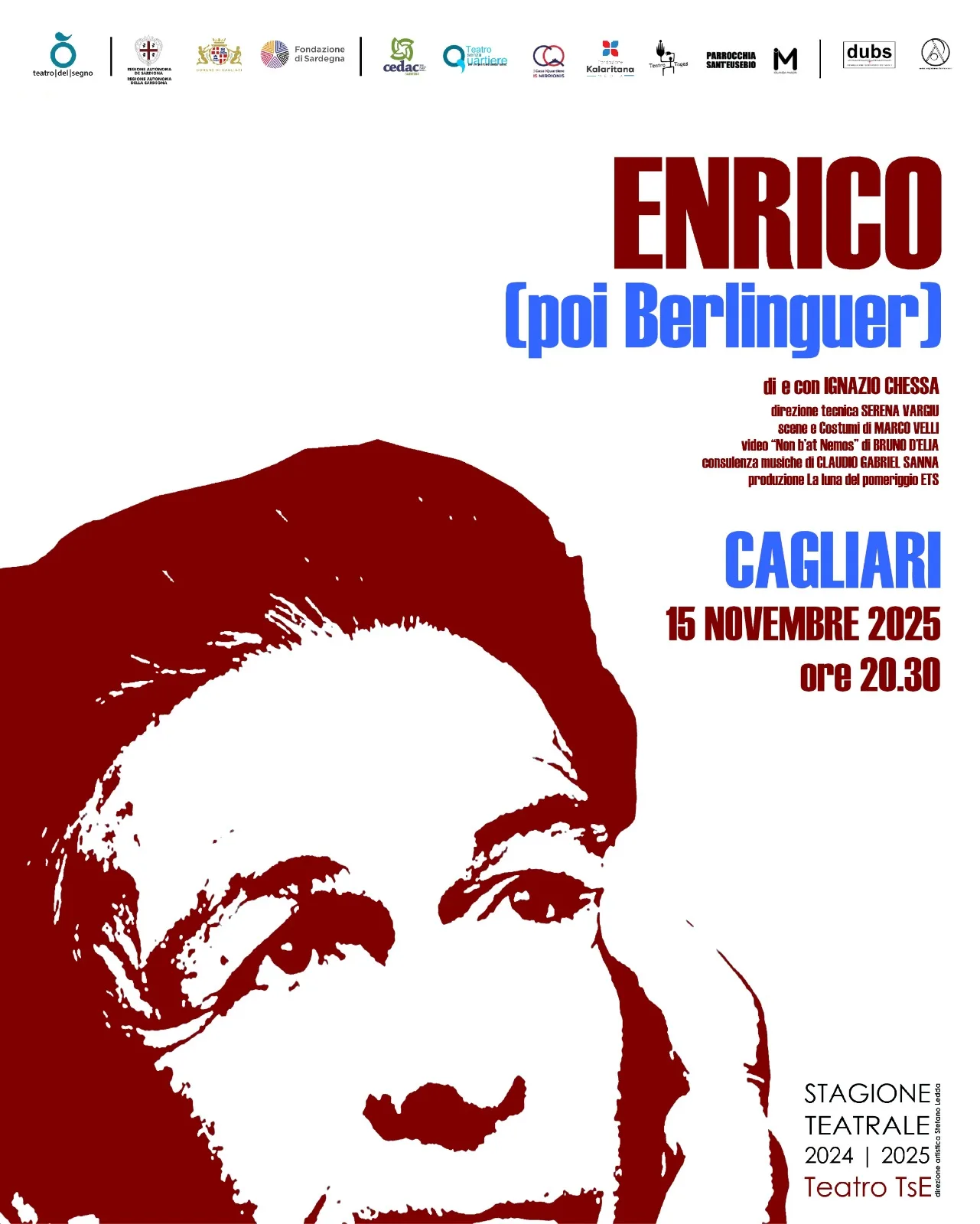 Un inedito ritratto dello storico segretario del Partito Comunista con “Enrico (poi Berlinguer)”, uno spettacolo ideato, diretto e interpretato da Ignazio Chessa, con scene e costumi di Marco Velli e consulenza musicale di Claudio Gabriel Sanna, video “Non B’at Nemos” di Bruno D’Elia, direzione tecnica di Serena Vargiu, produzione La Luna del Pomeriggio ETS in cartellone sabato 15 novembre alle 20.30 al TsE di Is Mirrionis, in via Quintino Sella, a Cagliari, nell’ambito del progetto pluriennale Teatro Senza Quartiere / per un quartiere senza teatro (2017-2026), con il patrocinio ed il sostegno della Regione Autonoma della Sardegna e il patrocinio del comune di Cagliari, e con il contributo della Fondazione di Sardegna.