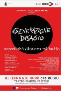 Settanta minuti di spettacolo per affrontare i problemi di una generazione il cui disagio “non è solo un ostacolo sulla strada, ma è la strada”. Il 21 gennaio alle 20.30, al Teatro Comunale di Ittiri MAB Teatro presenta il nuovo appuntamento della stagione culturale diretta da Daniele Monachella: “Dopodiché stasera mi butto”, una premiatissima commedia della compagnia “Generazione disagio” prodotta assieme a Proxima Res, realizzata ed interpretata dai bravissimi Enrico Pittaluga, Graziano Sirressi, Andrea Panigatti e Luca Mammoli, con la regia del co-autore Riccardo Pippa, il patrocinio del Comune di Ittiri ed il contributo di Fondazione di Sardegna.