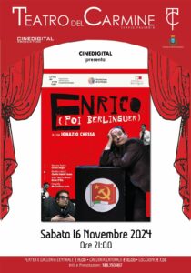 Il calendario messo a punto dal Teatro del Carmine, prevede per il prossimo 16 novembre la presenza sul palco di Ignazio Chessa, autore e protagonista del lavoro su Enrico Berlinguer, quasi una rievocazione della vita politica del Segretario del PCI, dalle prime esperienze a Sassari fino alla scomparsa prematura nel 1984, arrivata con il malore sul palco di Padova. Episodi storici, momenti privati, filmati d’epoca e il racconto di Ignazio Chessa, offriranno al pubblico momenti di riflessione.