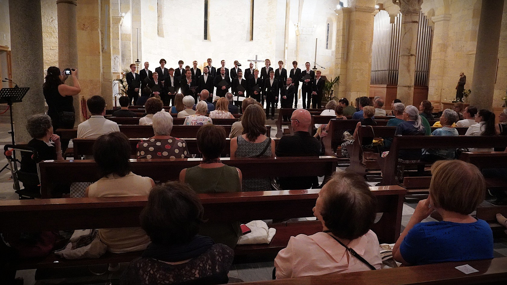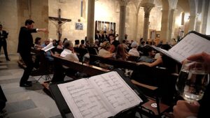 Forti emozioni ha suscitato Signum Magnum, un brano di Bonato estremamente evocativo, in cui i cantori, distribuiti intorno al pubblico, si sono esibiti utilizzando bicchieri di cristallo riempiti di acqua, suonati facendo scorrere il dito umido sul bordo superiore, producendo un effetto quasi ultraterreno e catapultando gli ascoltatori in una sorta di mondo magico, in cui le voci sono accompagnate da una sorta di vento cosmico, dal ”canto delle stelle”. Ogni bicchiere ha generato una nota diversa a seconda della forma e della differente quantità di liquido contenuto. Ad impreziosire l’accompagnamento è stato il violoncello del virtuoso bavarese Felix Stross. L’introduzione della serata è stata affidata al Coro Polifonico Turritano.