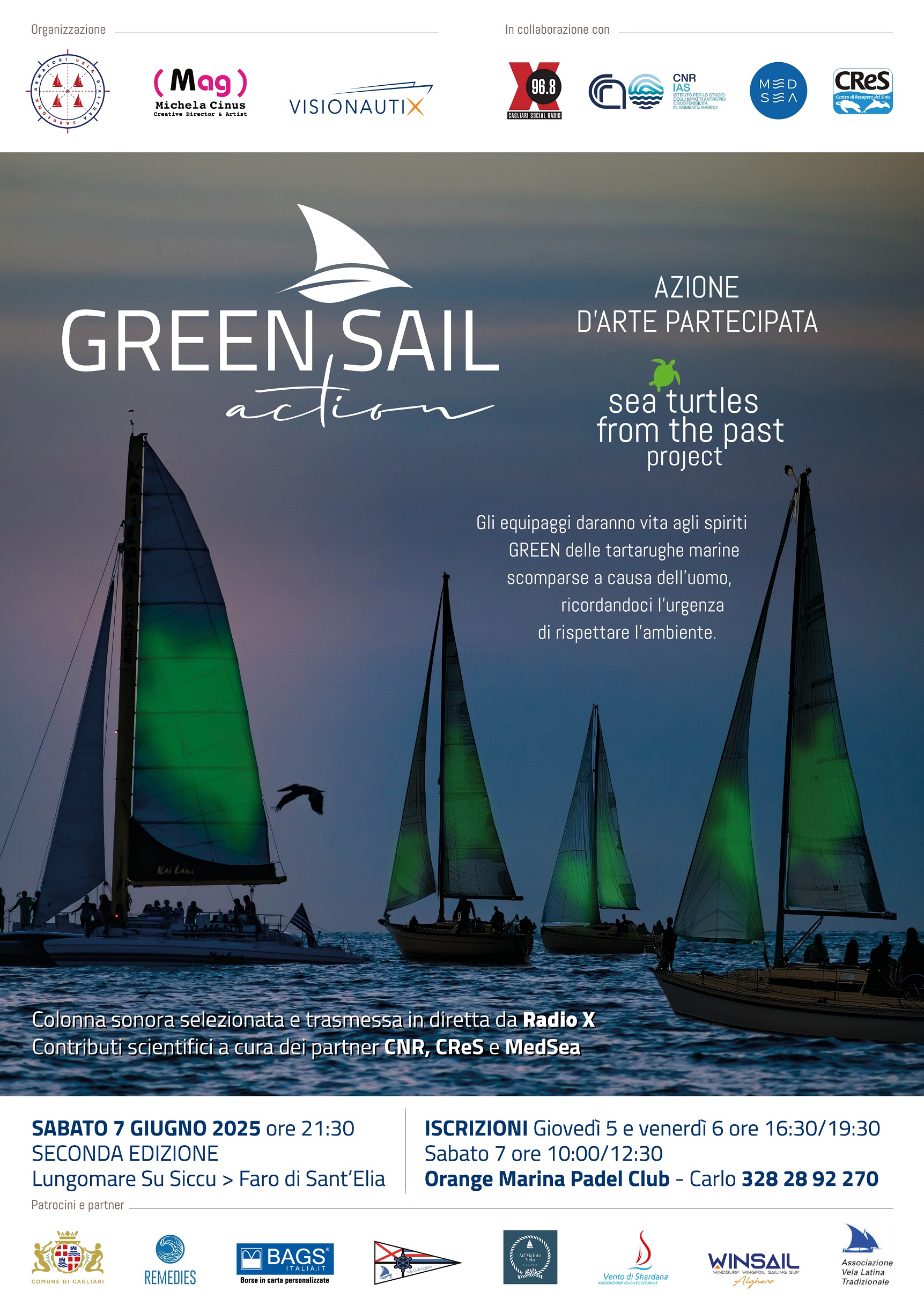 Alle 21,30 le imbarcazioni partiranno dall’area di Su Siccu per dare vita a un’esperienza collettiva in cui ciascuna di essa diventerà parte attiva di un’opera corale, visibile anche da terra. Le vele si trasformeranno in simboli itineranti, capaci di trasmettere un messaggio potente in difesa degli ecosistemi marini e, più in generale, della natura e del nostro pianeta. Il fulcro della manifestazione saranno le tartarughe marine del progetto Sea Turtles from the Past, ideato e curato da Michela Cinus dal 2016, che in quest’occasione tornano in scena come icone di forza, saggezza e vulnerabilità, invitando tutti a prendersi cura del mare e degli equilibri del pianeta. Nella Green Sail Action, questa missione si manifesta attraverso il verde che illumina le vele, colore della speranza e della rinascita, alternato a immagini semplici, delicate, significative, evocative degli spiriti delle tartarughe.