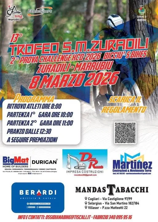 Per gli amanti del fuoristrada il Parco di Zuradili a Marrubiu sarà invece scenario della 13° edizione del Trofeo S.M. Zuradili. La gara, organizzata dalla Ossidiana Bike, si articolerà su due percorsi: uno corto di 3,4 km riservati alle categorie Esordienti e Allievi maschili e femminile, e uno lungo: 4,4 km per Juniores, Under 23, Elite e Master. Prima partenza alle ore 10.