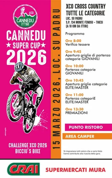 Nel Logudoro l’attenzione sarà rivolta a Thiesi dove domenica si disputerà l’XC Cannedu Super Cup 2026, prova di cross country che si svolgerà all’interno del bosco di Su Padru, in località Su Padru. Il tracciato prevede un giro di lancio di 150 metri su sterrato, seguito da un circuito tecnico ricavato interamente all’interno dell’area boschiva.