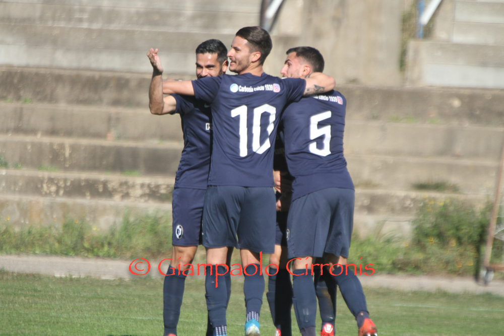 Quella della capolista Carbonia non è stata una vittoria facile. Andrea Marongiu non ha potuto schierare Federico Boi, squalificato per recidività in ammonizioni, e Suku Kassama Sariang, tenuto precauzionalmente a riposo per una leggera indisposizione intestinale. Al loro posto, ha inserito Matteo Saias al centro della difesa e Nicola Serra a centrocampo.