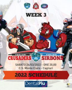 Inizierà con il derby tra le due squadre cagliaritane, il campionato nazionale CIF9 di Football Americano. I Crusaders Cagliari sabato 26 marzo ospiteranno i Sirbons Cagliari. Le due squadre fanno parte del girone A composto anche da due franchigie siciliane.