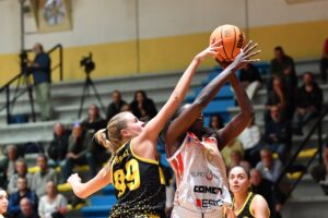 La seconda parte di gara è più complicata per le sarde, costrette a inseguire dopo i canestri di Favre, Ngamene e le due triple di Silvino Oliveira (44-40), a cui rispondono Erikstrup e Juhasz. Valdarno è aggressiva in difesa e mantiene il vantaggio a fine terzo quarto (51-47). Negli ultimi dieci minuti, la prima inerzia è a trazione toscana con i canestri di Celani, ma due triple di Pinna e Berrad consegnano il sorpasso alla Nuova Icom (56-58). Il finale è concitato: Bernardi pareggia, Mosetti firma il controsorpasso e Oliveira con un tiro da ben oltre i 6.75 allunga a 32 secondi dalla fine (53-59). Berrad segna due punti rapidi (63-61), dopo una lunga rimessa è ancora Bernardi a trovare il canestro, i secondi si erodono e Selargius recrimina anche qualche sfortuna al tiro. Finisce 65-61 con tre giocatrici di Valdarno in doppia cifra (Favre, Bernardi e Oliveira) e un bottino di 29 punti confezionato dalla panchina toscana, per il San Salvatore 24 di Juhasz, 12 di Erikstrup e 6 assist di D’Angelo.