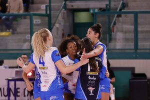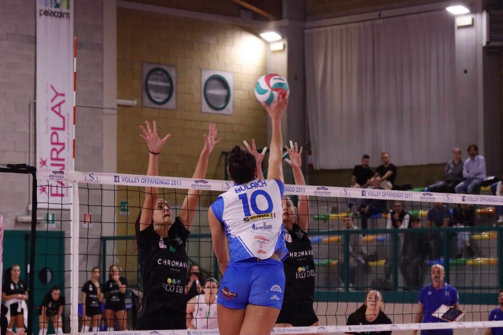 La gara. L’avvio di gara è molto equilibrato, con le due formazioni che danno vita a un interminabile punto a punto. L’Hermaea trova buonissime soluzioni al centro, ma è imprecisa in battuta. Offanengo allora si tiene in scia e sorpassa sul 18-17 con un muro vincente su attacco dalla seconda linea di Bulaich. Guadalupi spende il timeout, e al ritorno in campo le aquilotte accelerano volando sul 22-19 grazie al pallonetto di Schirò. Stavolta è Bolzoni a intervenire, e Offanengo reagisce tornando in parità a 23 con Bartesaghi protagonista. Si torna sui binari del punto a punto, che conduce fino ai vantaggi: qui l’Hermaea si mostra più lucida con gli angoli trovati da Schirò e il muro punto di Bridi che fissa il punteggio del primo set sul 28-26.