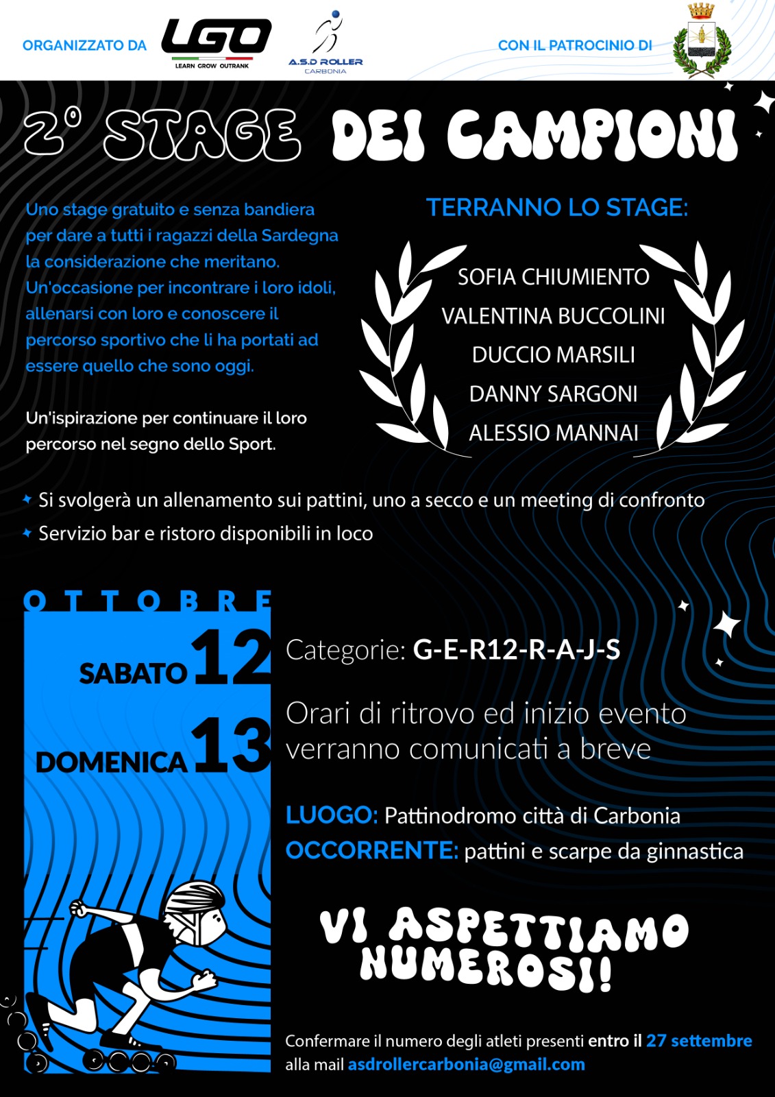Sabato 12 e domenica 13 ottobre, dalle ore 10.00 alle ore 18.00, il pattinodromo di via Balilla ospiterà la manifestazione denominata “2° Stage dei campioni”, organizzato dall’A.S.D. Roller Carbonia e LGO, con il patrocinio del comune di Carbonia. Si tratta di un evento sportivo a carattere regionale, uno stage tenuto da diversi campioni in carica nelle categorie assolute della disciplina del pattinaggio corsa, rivolto ai giovani di atleti di tutte le società sarde.