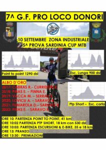 Sempre domenica ci sarà grande attesa per la 7ª Gran Fondo Pro Loco di Donori. Si tratta di una point to point fuoristrada organizzata dalla Donori Bike Team. Sarà una gara di 41 km complessivi costruita su due giri distinti. Nel primo, 19 km con metà Salita delle Cave, lunghi falsopiani e piccole salite con un dislivello di 500 metri circa. Nel secondo, 22 km circa, intera Salita delle Cave (3,1 km), altra salita di S’Isca Manna (2,5 km), poi lunghe discese e un single track a 5 km dalla fine. In questo caso il dislivello aumenta fino a 700 metri. Partenza alle ore 10.00 dalla zona industriale di Donori sulla SS 387.