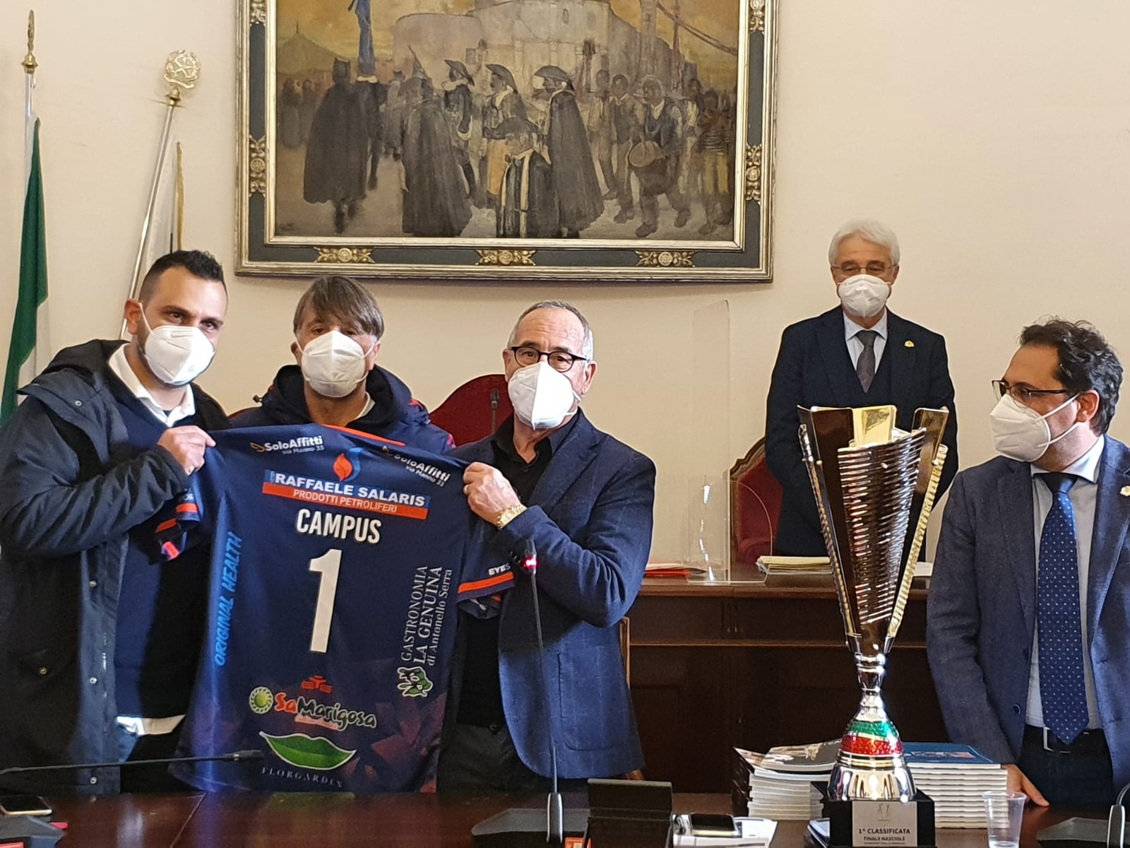 Gli atleti hanno consegnato nelle mani del sindaco Nanni Campus la maglia della squadra con il numero 1, mentre il primo cittadino ed il presidente del Consiglio Maurilio Murru hanno donato a tutti libri sui Candelieri.