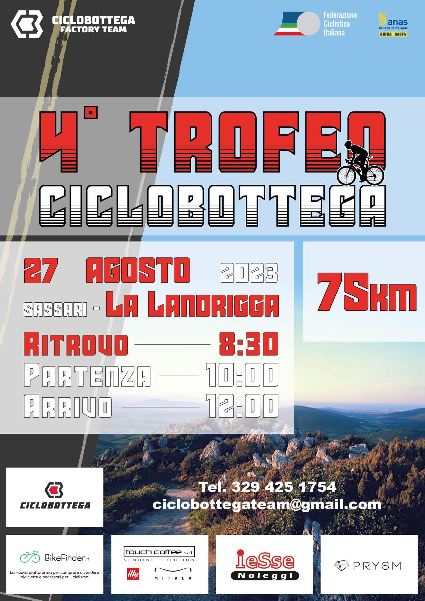 I Master torneranno invece a sudare a Sassari dove la Ciclobottega Factory Team ha organizzato per domenica il 4° Trofeo Ciclobottega. Sarà una gara di 76 km che da La Landrigga porterà i corridori lungo i centri di La Corte, Monte Forte, Palmadula, Canaglia, Monti di Bidda, Olmedo, per poi fare ritorno a La Landrigga. Tracciato invariato rispetto alle passate edizioni, molto veloce, divertente e tecnico. Partenza alle ore 10.00 da via Montiferru.