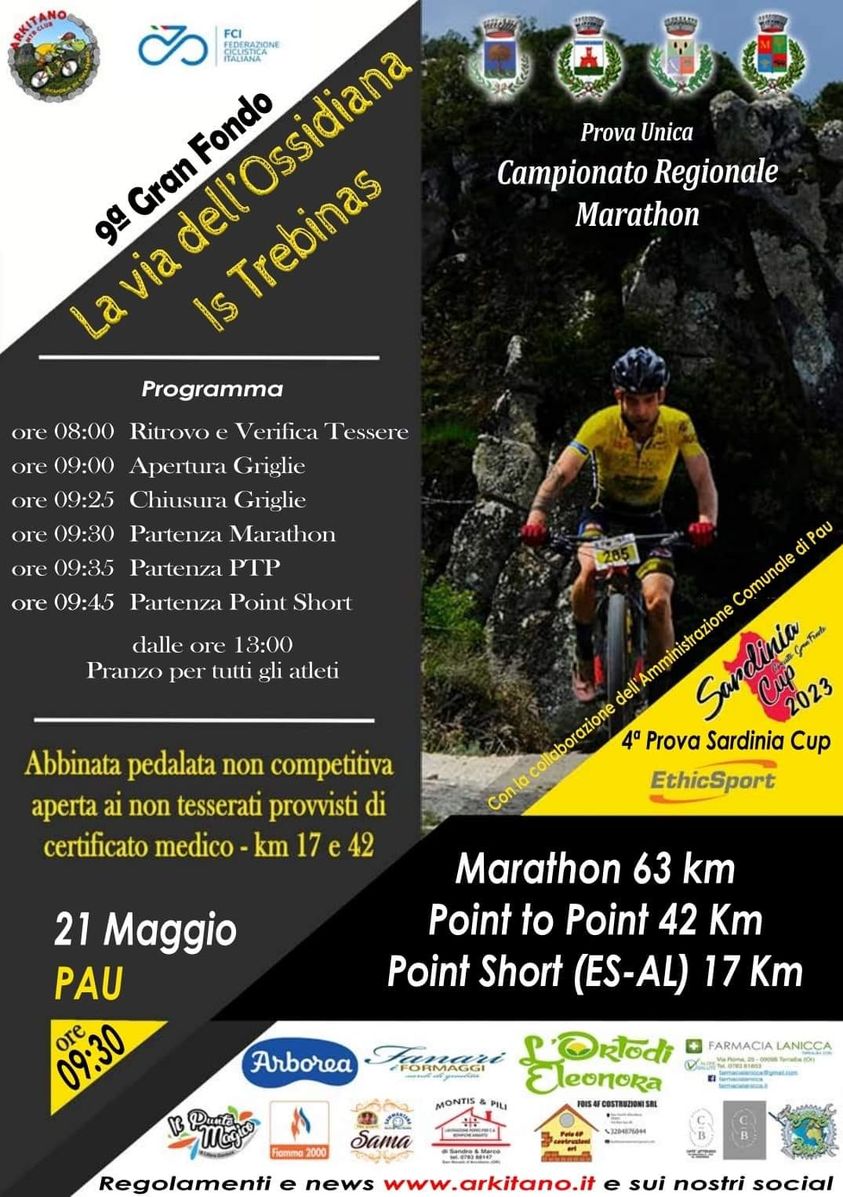 Sarà una consueta domenica di impegni per le centinaia di ciclisti sardi in SardegnaIl centro nevralgico degli amanti del bici fuoristrada sarà Pau. Nell’oristanese andrà in scena “La via dell’Ossidiana Is Trebinas”, organizzata dall’Arkitano MTB. Un ricco menù, la gara lunga di 65 km sarà valida come prova unica per il Campionato Regionale Marathon. Dal centro abitato di Pau, su strada asfaltata, gli specialisti delle ruote grasse entreranno all’interno del parco di Monte Arci, attraverseranno strade e sentieri vecchi di millenni prima di entrare nel bosco per gran parte del tracciato. Partenza alle 9,30 da via San Giorgio. Oltre alla Point to Point, il comitato organizzatore ha allestito anche una gara più corta (42 km) e una pedalata non competitiva.