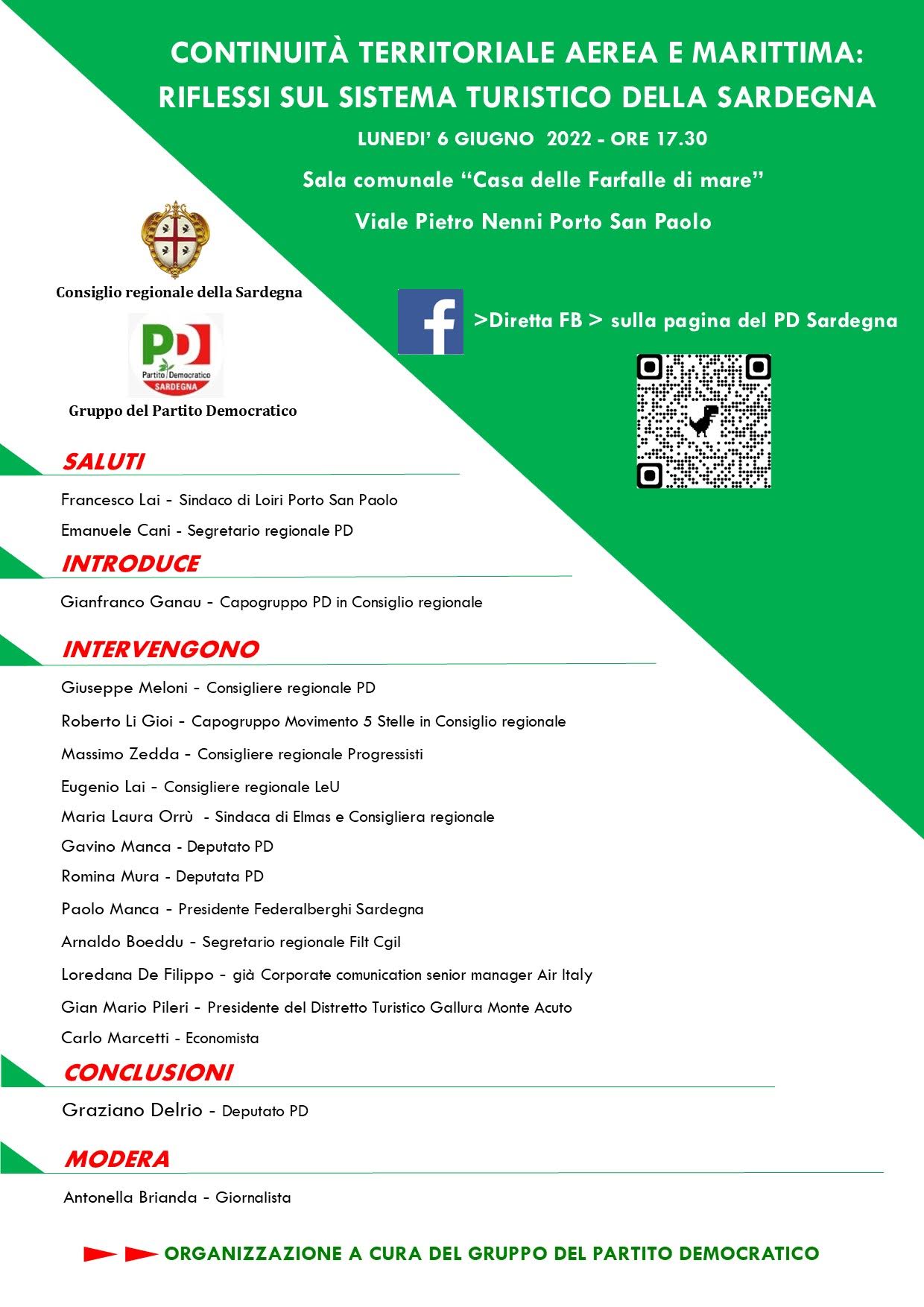 Lunedì 6 giugno 2022, alle ore 17,30, presso la sala comunale “Casa delle farfalle di mare”, in viale Pietro Nenni, a Porto San Paolo, si parlerà di “Continuità territoriale aerea e marittima: riflessi sul sistema turistico della Sardgna”.