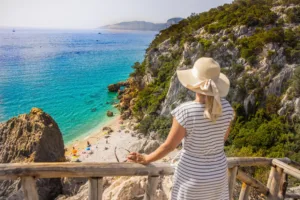 View of a blonde woman looking at the beach from a lookout, Sardinia, Italy.
