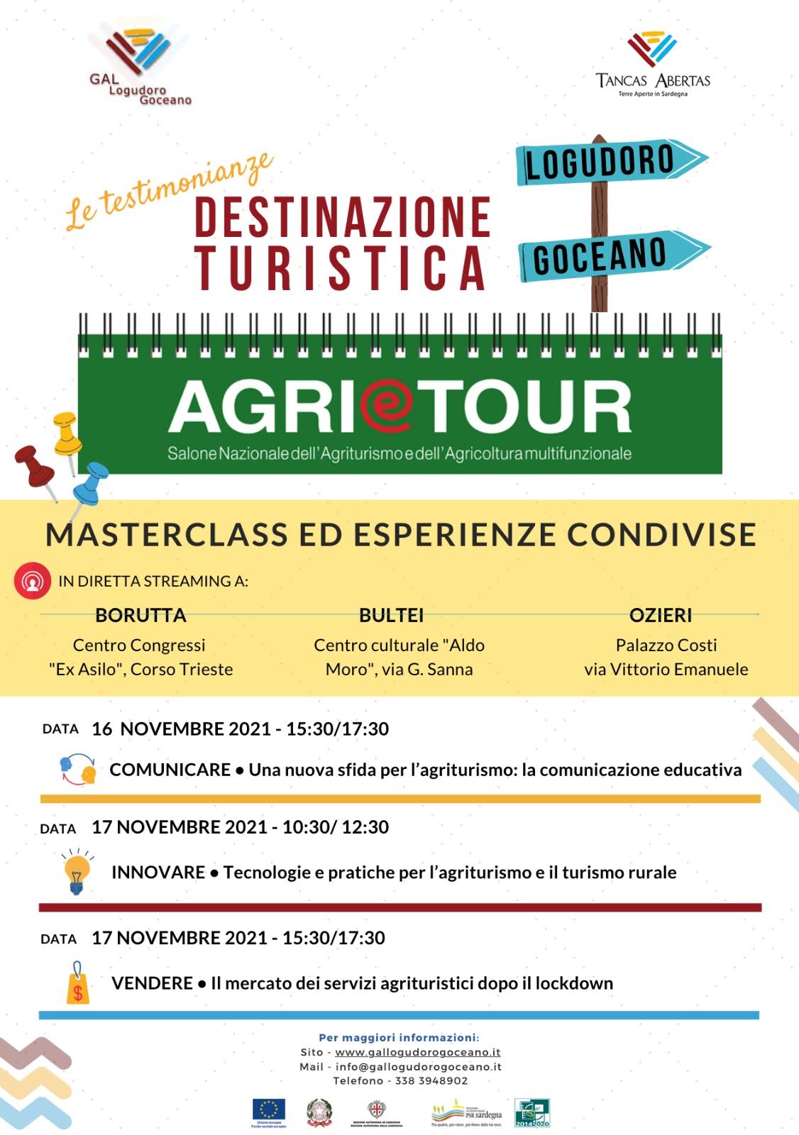 Il 16 e 17 novembre il GAL Logudoro-Goceano organizza tre masterclass formative di alto livello a cura di esperti del settore turistico, un’occasione di formazione straordinaria per il territorio, gratuita e aperta a tutti, dedicata ai tre aspetti chiave della comunicazione, dell’innovazione e la vendita.