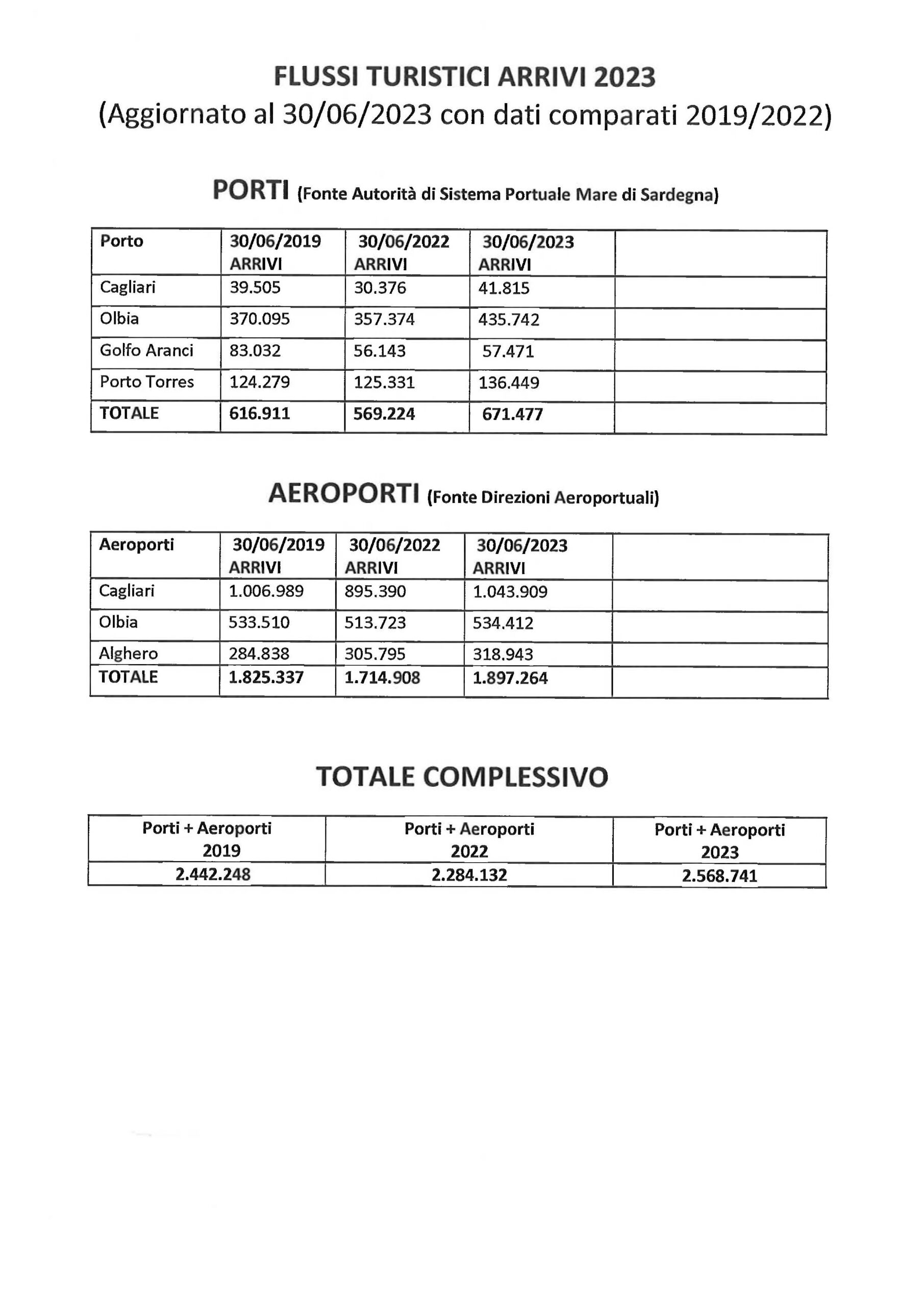 Lo ha detto l’assessore del Turismo, Gianni Chessa, comunicando i numeri degli arrivi in Sardegna fino al 30 giugno 2023: in totale sono stati 2.568.741; nel 2022, 2.284.132; nel 2019, 2.442.248. Nel dettaglio: nei porti, 671.477 (2023); 569.224 (2022); 616.911 (2019); negli aeroporti, 1.897.264 (2023); 1.714.908 (2022); 1.825.537 (2019).